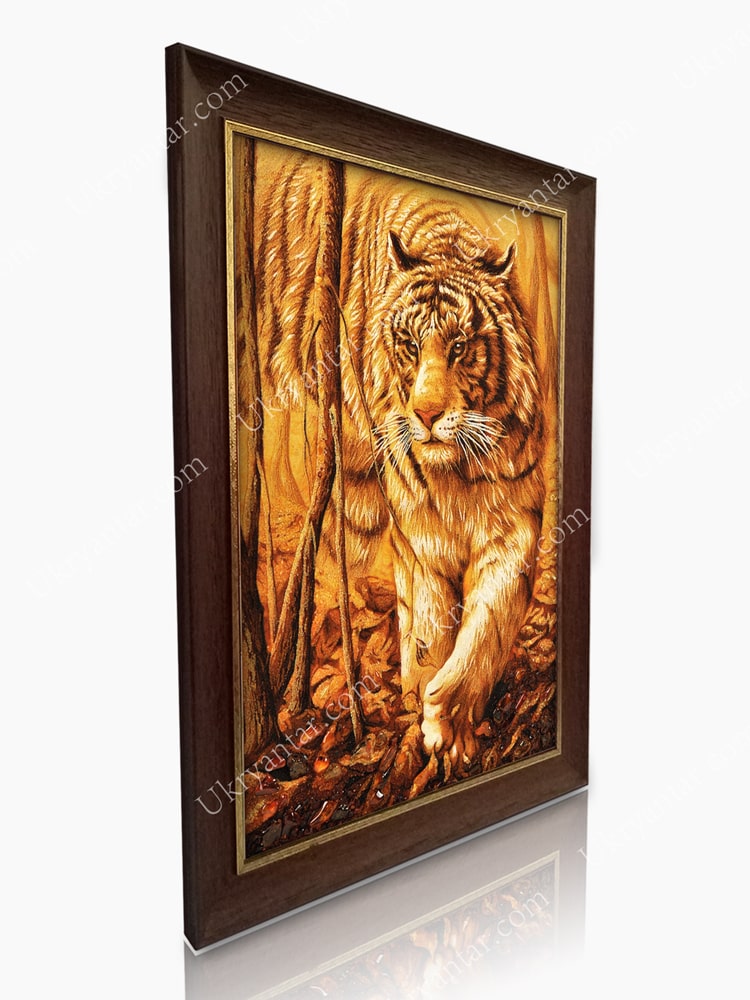 The amber painting Picture "Tiger", fascinating with its beauty and harmony, is an amazing gift to any significant event in the decorative frame. Impresses with special expressiveness, amazing aesthetics, impeccability of the plot line. Is a high-class professional work of manual production from natural amber. Looks gorgeous. Looks presentable. It will become a solid rare present for women and men for any holiday, an important date. Will help to congratulate dear people in an original, exquisite, expensive and unforgettable.