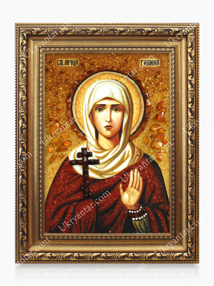 Икона из янтаря Галина представляет полотно, на котором образ праведницы изображен с помощью специальных красок и объемных отделочных элементов – янтаря. Лик святой отведен в сторону. Взгляд спокойный и одухотворенный. Это показывает уверенность в невидимом как видимом. Складки на одежде драпируются не мягко, а специально резко, что характерно для православной иконописной школы. Идеально сочетаются теплые и холодные тона - желтый и синий. В правой руке святая бережно держит крест как символ победы над смертью. Рамка золотисто-медного оттенка. Нимб усыпан янтарями.