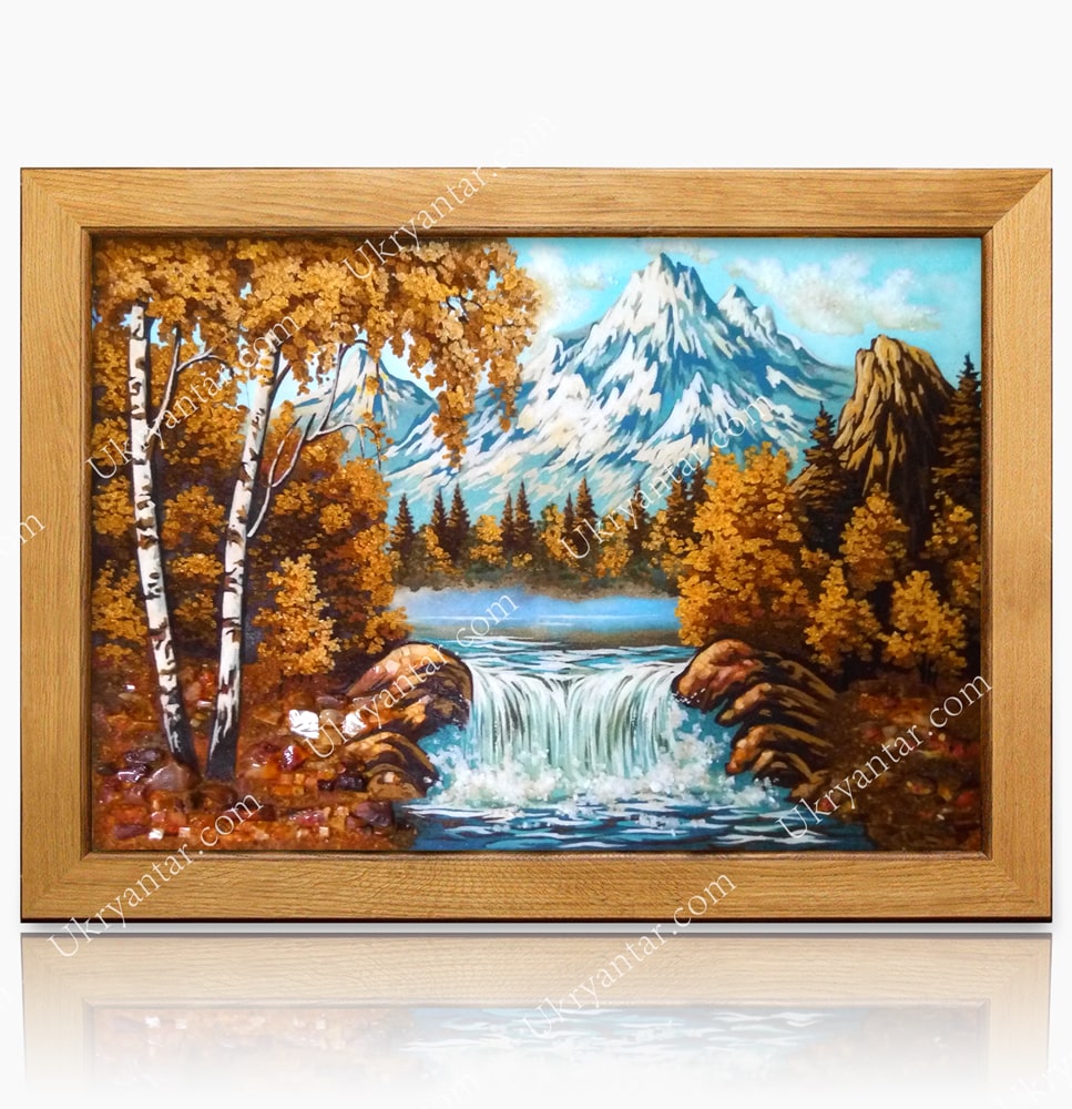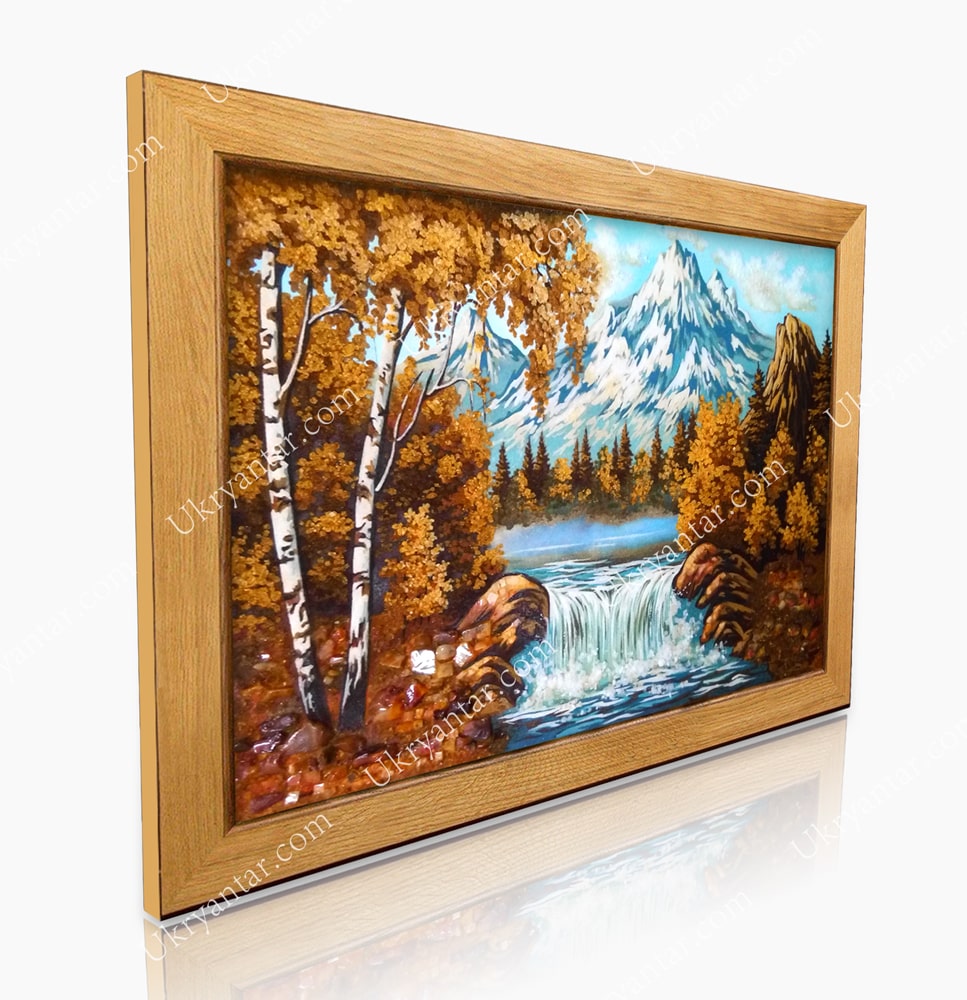 Картина из янтаря изображает спокойный пейзаж с двумя высокими березами, которые стоят более ярко на переднем плане. Тонкие белые стволы деревьев резко контрастируют с золотистым цветом осенней травы и кустарников, которые окружают их. Небольшой водопад ласково распространяется мимо деревьев, а его прозрачная вода блестит на солнце. На заднем плане возвышаются величественные горы. Небо имеет мягкий голубой оттенок, а пушистые белые облака лениво плывут по пространству. Общий эффект картины вызывает спокойствие и гармонию. Березы, с их нежными листьями, кажется, приглашают зрителя войти в сцену и присоединиться к ним в тихом размышлении, а горы в дали добавляют нотку величия и таинственности к сцене. Цвета, использованные на картине, в основном теплые и смягченные, с оттенками коричневого, оранжевого и золотого. Это придает картине ощущение спокойствия и гармонии, как будто изображенный мир находится в покое и гармонии.